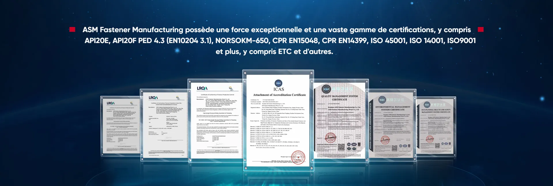 Les certifications de l'entreprise comprennent ISO 9001: 2000, ISO 14001, ISO 45001, Licence spéciale de fabrication d'équipements (pipeline de pression) Certification TS, Norsok M650, EU CE, PED 4.3, CPR 14399, CPR 15048 et EN 10204 3.1, entre autres.